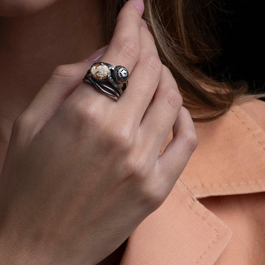 Anillo cuarzo fumé y perlas