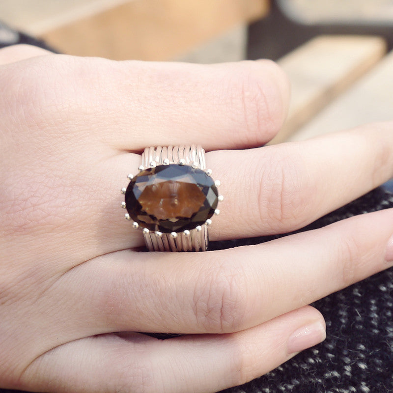 Anillo cuarzo, hecho a mano con un cuarzo fumé en el centro y realizado con hilos en plata brillante que finalizan en un contenedor de perlas que mide doce por dieciséis milímetros. Es uno de nuestros anillos estrella, bellísimo e inimitable dada la complejidad de todo el proceso de creación. Para realizar el anillo cuarzo se empieza por transformar la manualmente en hilos que se van moldeando y uniendo hasta conseguir que suban y formen una jaula en la que se sitúan pequeñas perlas naturales y se engasta en lo alto el cuarzo fumé.
