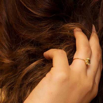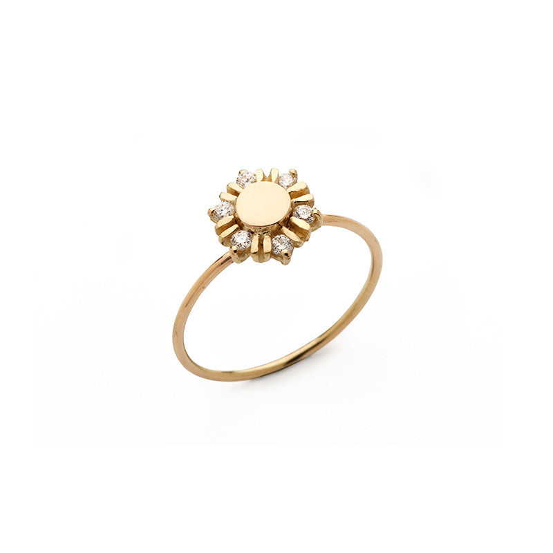 El anillo diamantes, realizado en oro amarillo de 18 kt es un diseño que tiene en el centro un medallón y alrededor una orla con seis diamantes, talla brillante, que pesan 0,18 quilates con las siguientes calidades técnicas: Color: G y Claridad: VS2. Es una joya especial y exclusiva, hecha a mano y con un diseño personal. Si buscamos algo distinto al anillo solitario, con un solo brillante como protagonista, este anillo diamantes es una seductora propuesta de anillo de compromiso.