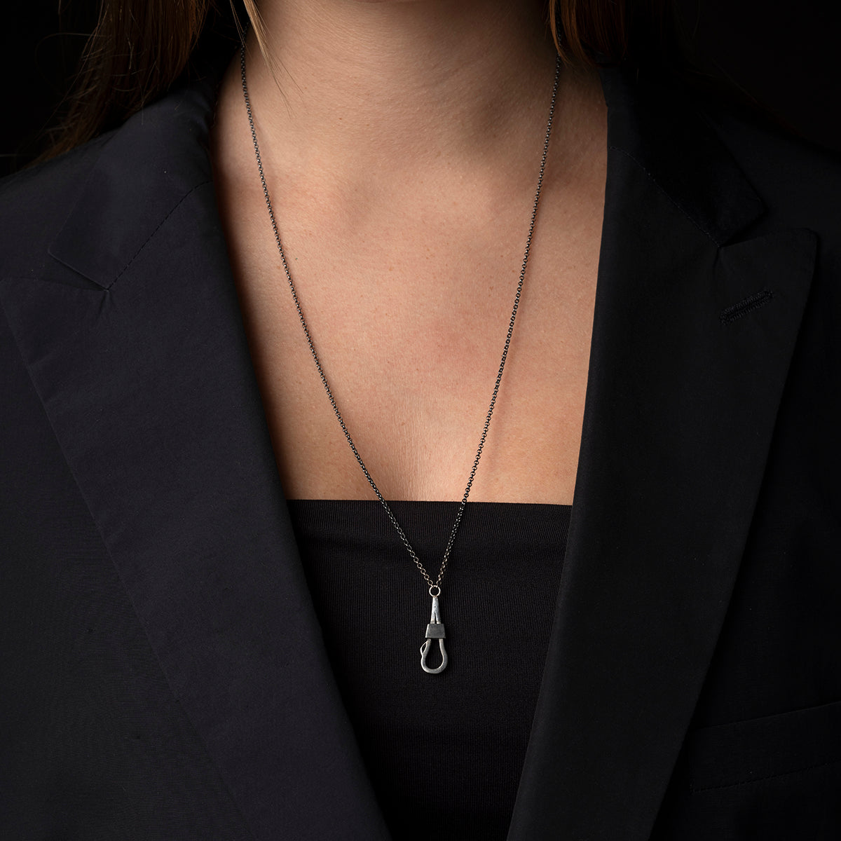 El mosquetón Plata es un colgante neutro y versátil al que aportar el carisma que desees. Una joya para transformar cada día según añadas dijes, medallas o cualquier detalle emocional, como aquel anillo antiguo de la familia que guardabas sin encontrar su lugar.